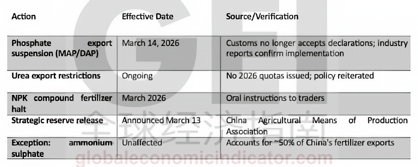 – Phosphate export ban. Since March 14, phosphate fertilizer exports—including monoammonium phosphate and diammonium phosphate—have been suspended until at least August. Customs authorities are no longer accepting export declarations for these products, and shipments that had been declared but not yet cleared have been delayed. Major producers including Yuntianhua, Xingfa Group, and Xinyangfeng have confirmed they have halted export declarations and shipments.